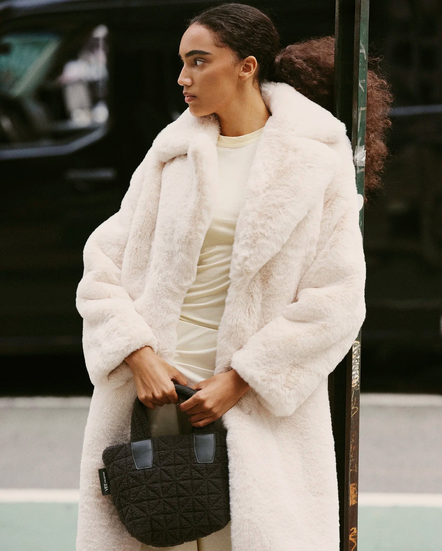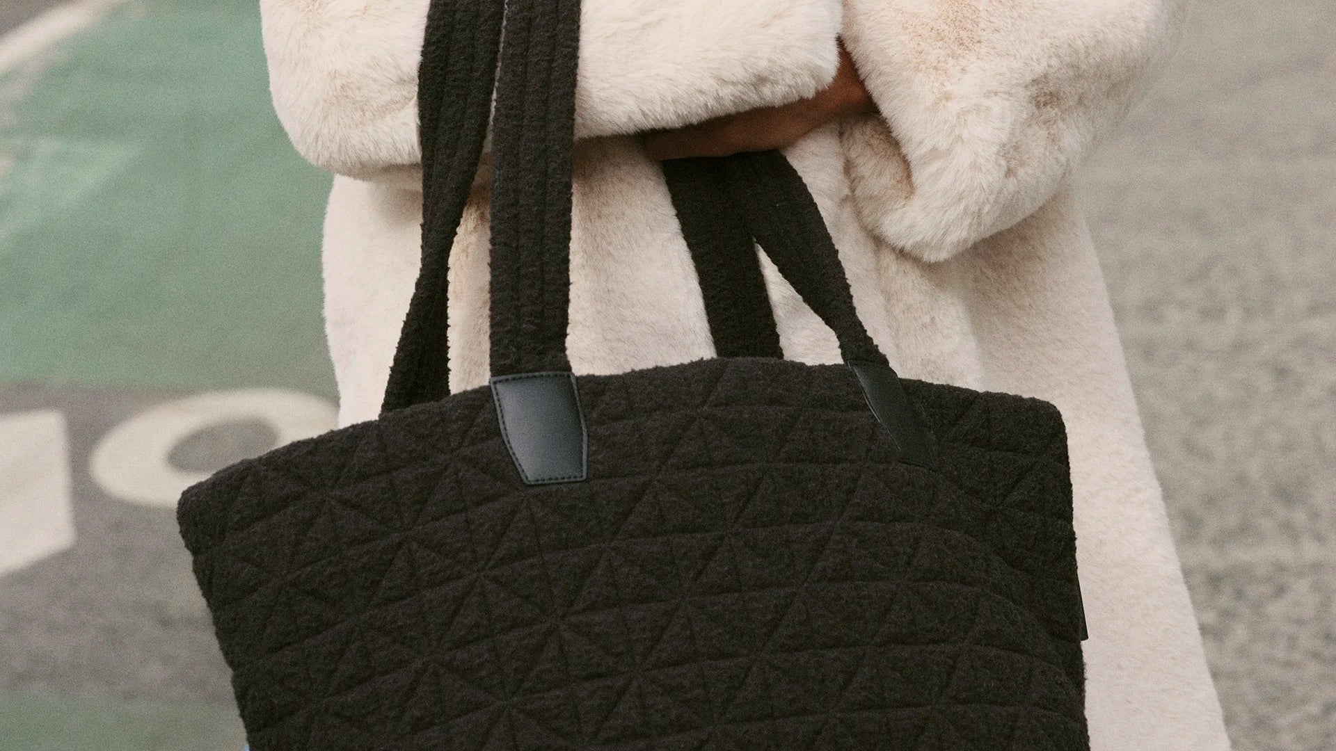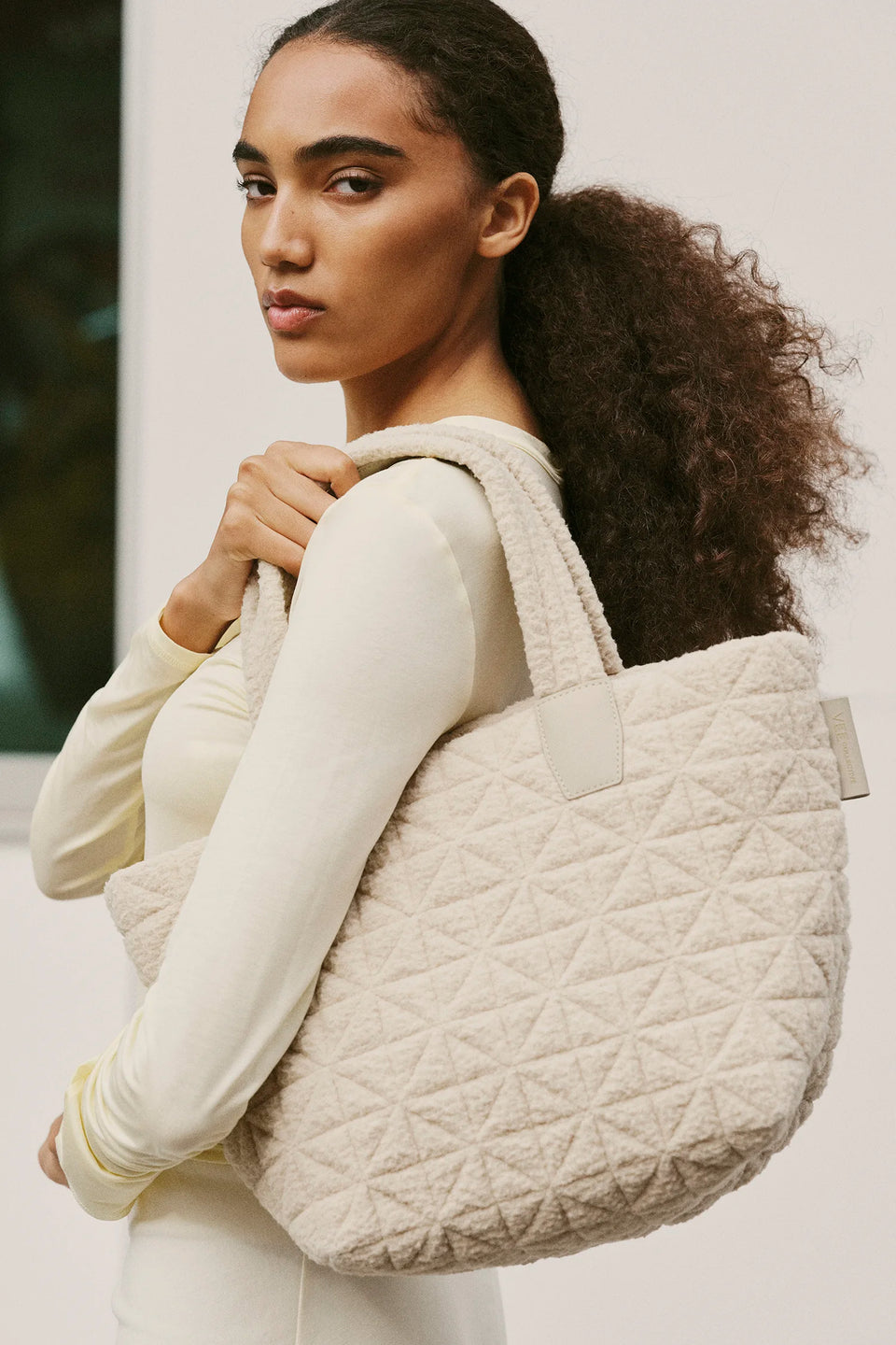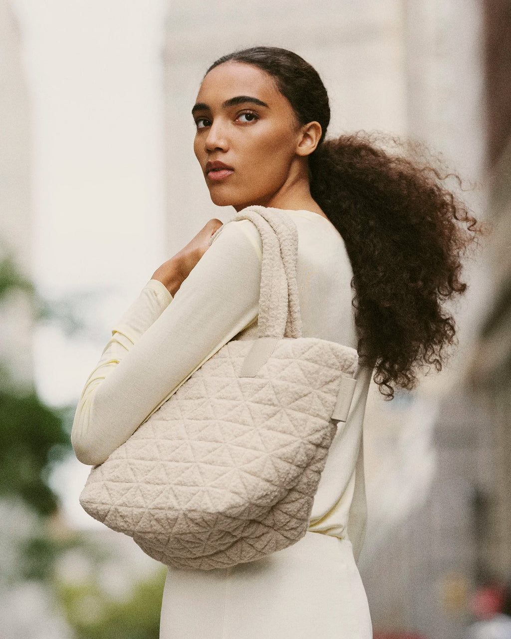 Unsere Entdeckungsreise mit neuen Materialien geht weiter – mit den Vee Sherpa Bags in Cream und Black. Das 100% recycelte Fleece-Material ist perfekt für die kälteren Monate und macht diese Tasche zu einem haptischen Statement-Piece, das für Komfort und Vielseitigkeit steht.